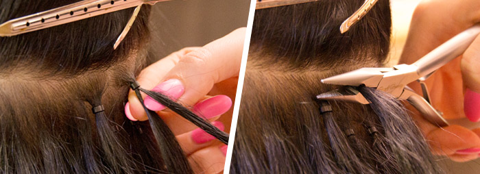 | Micro Ring | Upevnění kovovými kroužky bez tepla | Snadná až amaterská aplikace, snadný posun | Viditelné u jemných vlasů, čas, výčes, zkrácení jako u keratinu. Spoje jsou velmi tvrdé, nepříjemné, bolestivé. Alergie díky kovovým kroužků je běžná. | |